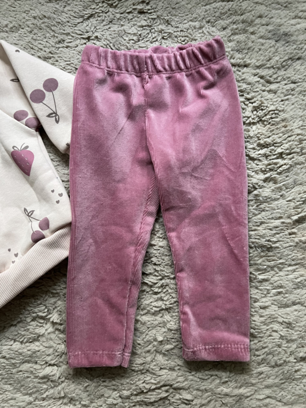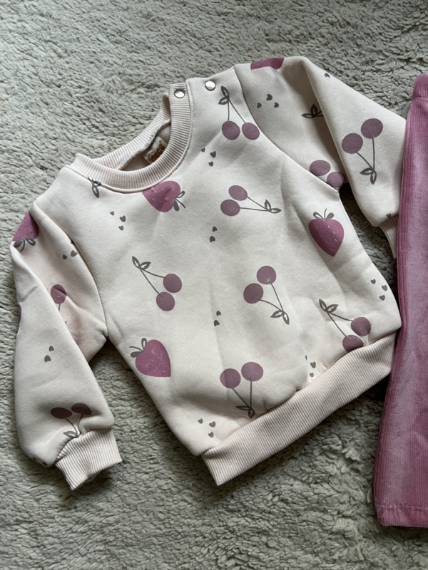 Schattige sweater met afdruk van kersen en aardbeien. Met bijpassende roze fluwelen broek.