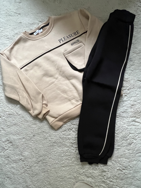Stoer setje bestaande uit een lichtbruine sweater met zwarte broek.
